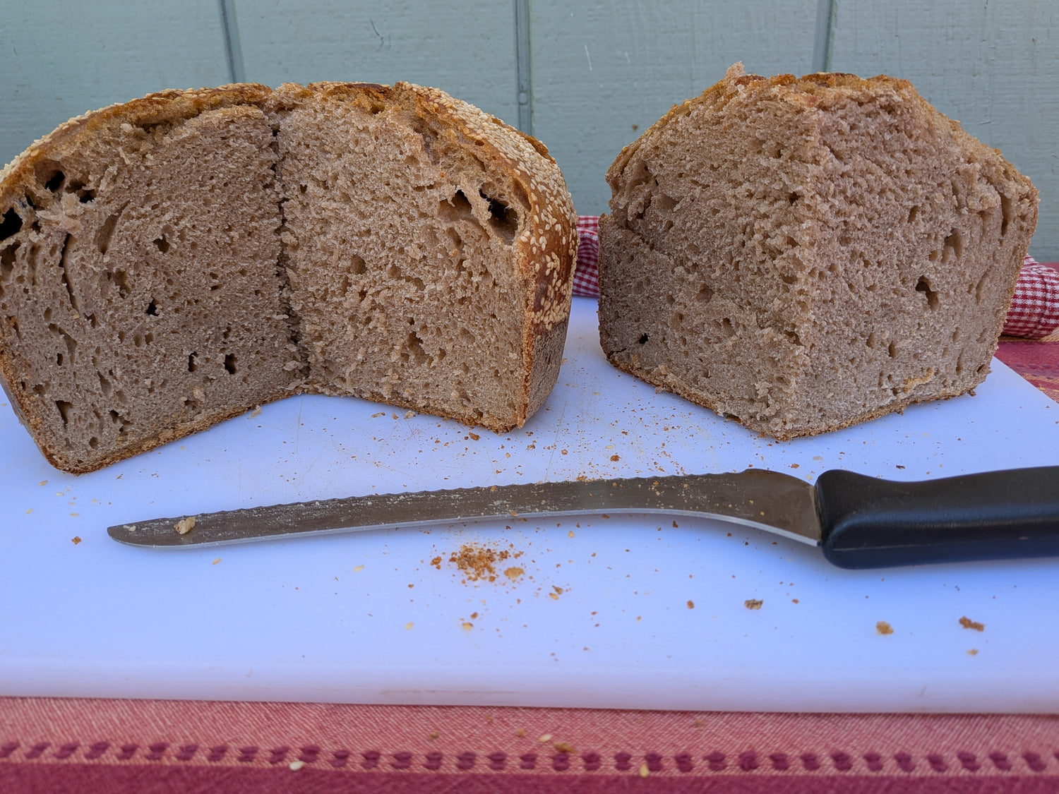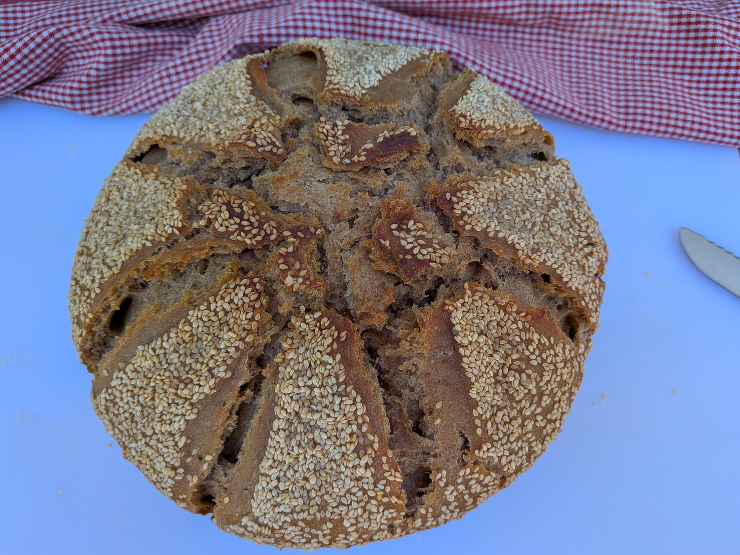 Our Sesame-topped bread contains organic, whole grain flour, water, kosher salt and sesame